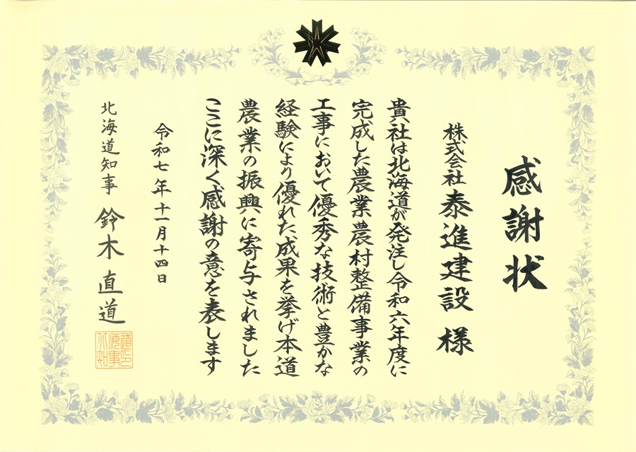 11月14日に【令和7年度 農業農村整備事業優秀業者感謝状贈呈式】が開催され 農政部が所管する農業農村整備事業に係る工事及び委託業務を 受注した業者のうち、 特に施行成績等が優秀な業者として知事感謝状をいただきました。